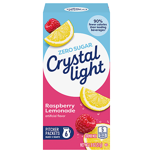 Crystal Light Artificially Flavored Raspberry Lemonade Powdered Drink Mix is a refreshing beverage you can enjoy at any time of day. With zero grams of sugar and only 5 calories per serving, Crystal Light is a sweet alternative to juice and soda and has 90 percent fewer calories than leading beverages (this product 5 calories, leading beverages 70 calories), so you don't have to choose between taste and calories. Classic lemonade with raspberry flavoring offers a refreshingly smooth taste. Each pitcher packet of powdered lemonade mix in this 6 count canister is perfectly portioned to make 2 quarts or 1 pitcher of Crystal Light lemonade, so there's plenty to share with family and friends. Simply mix one lemonade packet with 8 cups or 2 quarts of water, stir, and enjoy! All the flavor and only 5 calories... just the way you like it.