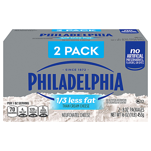 Dive into immersive pleasure with Philadelphia Neufchatel Cheese with 1/3 Less Fat than Cream Cheese. Made with fresh milk and real cream for an extra creamy, multi-dimensional taste you can add to any meal. At Philly, we leave out the preservatives to ensure a rich, quality flavor. Containing 1/3 the fat of our original cream cheese, Philadelphia is easy to use in baking, making it the perfect choice for adding to your favorite cheesecake recipe or using as an ingredient in frosting. Stock up with our 2 pack of 8 ounce neufchatel cheese blocks and make sure to keep them refrigerated. With Philadelphia Neufchatel Cheese, enjoy a rich, creamy experience you don't just taste, you feel.