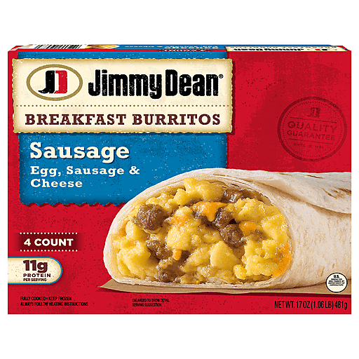 Elevate your mornings with Jimmy Dean Sausage Breakfast Burritos. With real eggs, savory sausage, and melted cheese, our Jimmy Dean frozen burritos are perfect for those who crave a breakfast that delivers on flavor and convenience. Each tasty breakfast burrito is made with eggs, sausage, and cheese, all wrapped in a soft flour tortilla. Whether enjoyed as the ultimate grab-and-go breakfast or as an easy on-the-go bite, Jimmy Dean Breakfast Burritos have 11 grams of protein per serving. Our frozen sausage breakfast burritos come fully cooked and ready to heat. To prepare, simply remove the wrapper and wrap the burrito in a paper towel before heating in the microwave according to the directions on the box. Warm and satisfying, our savory breakfast burritos are the meaty microwave breakfast to kickstart your day.