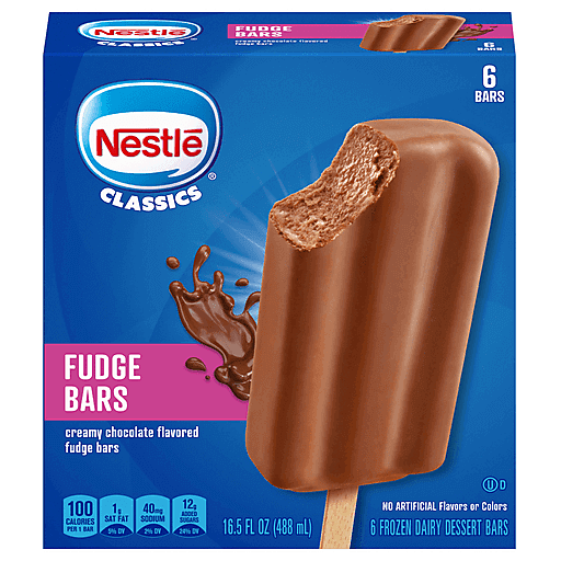 Nestle Creamy Chocolate Fudge Bars offer a deliciously classic dessert with rich chocolate flavor. Every bite delivers the creamy chocolate fudge flavor you love. These frozen dessert bars are made without artificial flavors or colors for a snack you can feel good about eating or offering to your family. Serve the chocolate fudge bars as an after-dinner dessert to delight kids and adults alike, or offer them at birthday parties, backyard barbecues or other celebrations for a convenient frozen treat. Enjoy a chocolate fudge bar for a bit of indulgence when you want something sweet. Each chocolate fudge bar comes individually wrapped for quick and easy snacking. Each box contains six frozen dessert bars. Store chocolate fudge bars in the freezer.