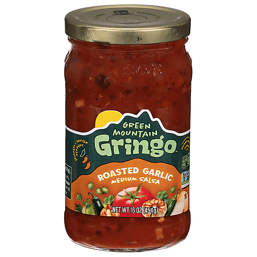 GREEN MOUNTAIN GRINGO SALSA, ROASTED GARLIC IS AN ALL NATURAL MEDIUM SALSA. IT IS CERTIFIED GLUTEN-FREE, KOSHER-PARVE BY U.S. KOSHER SUPERVISION, AVA-VEGETARIAN AND NON-GMO. THIS SALSA CONTAINS NO PRESERVATIVES AND IS 100% FAT-FREE. EACH JAR CONTAINS 16 OZ. OF ROASTED GARLIC SALSA. SEE NUTRITION FACTS PANEL FOR ALLERGEN INFORMATION.