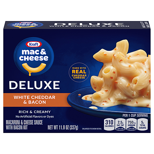 Help yourself to a bowl of comfort. Kids and adults love the rich taste of Kraft Deluxe White Cheddar & Bacon Mac & Cheese Macaroni and Cheese Dinner. Our 11.9-ounce mac and cheese box includes macaroni pasta and white cheese sauce mix with bacon bits to make tasty mac and cheese kids love. Our warm, cheesy macaroni goodness fills your belly and feeds your soul. With no artificial flavors or dyes, Kraft Macaroni and Cheese is always a great choice for family dinners. Looking for quick meals, sides or kids meals? Simply boil 2 quarts of water, stir in macaroni and cook 11-12 minutes. Drain the macaroni, do not rinse and return to the pan. Then squeeze the cheese sauce over the hot macaroni, add bacon and stir until blended. Stir up new ways to enjoy Kraft Mac n Cheese by adding protein or seasonings to make it your own. Try shredded rotisserie chicken, steamed broccoli, hot sauce, and more! A wholesome tradition, Kraft Mac & Cheese has been bringing generations together since 1937. Kraft Mac & Cheese inspires the positive power of comfort, so keep your pantry stocked with our dinner sides and enjoy cheesy goodness anytime.