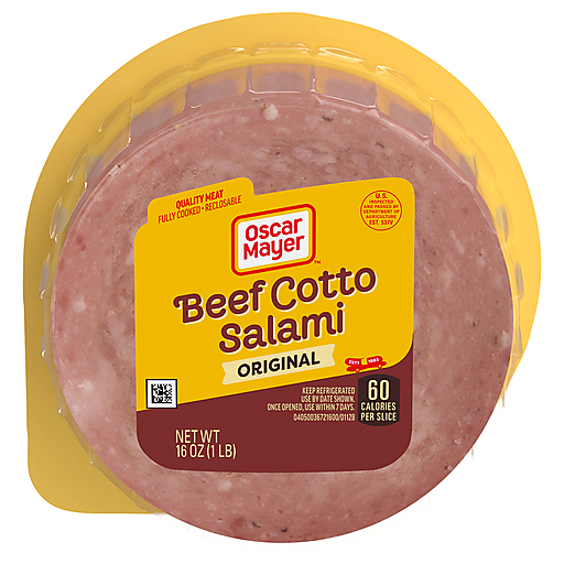 Craft the perfect sandwich with Oscar Mayer cold cuts. Oscar Mayer Beef Cotto Salami Sliced Lunch Meat is made with quality meat and packed with flavor. Made with beef, our fully cooked cotto salami is ready to eat. Add Oscar Mayer lunch meat to sandwiches, wraps or a charcuterie board. Beef cotto salami is delicious as an addition to salads, alone as a snack, or paired with cheese and crackers. Keep our 16-ounce pack of beef cotto salami sandwich meat refrigerated in the resealable package to ensure freshness. If you enjoy our beef cotto salami, try our hard salami lunch meat and many other varieties of deli department cold cuts.