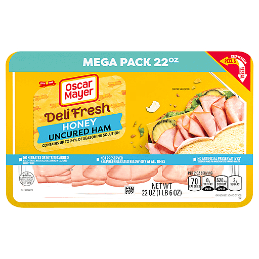 Make a delicious deli sandwich at home with Oscar Mayer Deli Fresh Honey Uncured Ham Contains up to 24% of Seasoning Solution Browned with Caramel Color Sliced Lunch Meat. Our quality honey ham deli meat is made with no artificial preservatives see back panel for ingredients used to support quality, and no added nitrates or nitrites except those naturally occurring in cultured celery juice. Fully cooked and ready to eat, our uncured ham slices have a mouthwatering sweet flavor with a touch of honey that's perfect for a sandwich, salad, or cheese and crackers. Keep our mega pack 22-ounce package of deli ham refrigerated to maintain freshness. If you enjoy our honey deli ham, be sure to try the other varieties of Oscar Mayer ham lunch meat.
