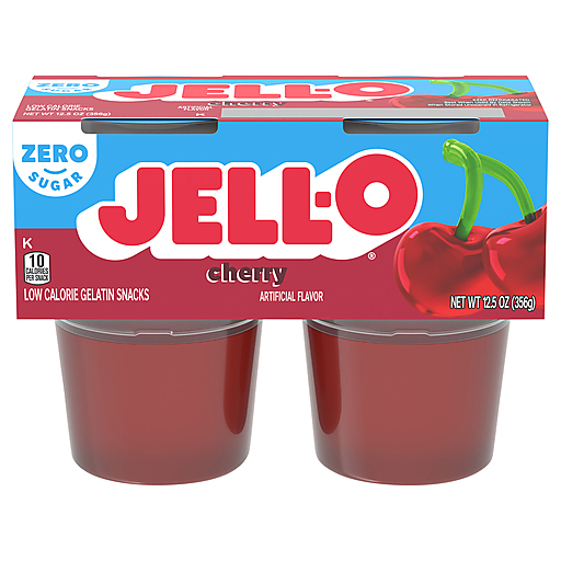 Jell-O Zero Sugar Ready-to-Eat Cherry Artificially Flavored Gelatin Cups deliver the great taste of Jell-O Gelatin in a low-calorie choice. Our delicious on-the-go treat comes in individual snack cups, perfect for putting into a lunchbox or snacking at home. Zero Sugar artificially flavored cherry gelatin is fat-free and contains 10 calories per serving. Great for those keeping Kosher. Each sleeve contains four Jell-O Zero Sugar Ready-to-Eat Cherry Artificially Flavored Gelatin cups for quick and easy snacking.