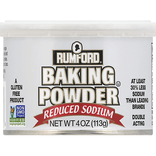 Rumford Reduced Sodium Baking Powder is a balanced, double-acting baking powder and is NON-GMO project verified. Containing zero trans fat it has be the first choice of bakers for many years. This 4 oz. can features a pop top and leveling edge for accurate measuring. Known for its dependable results, Rumford's double acting formula releases carbon dioxide when exposed to moisture and heat. See the container for the best buy date (or six months after opening).